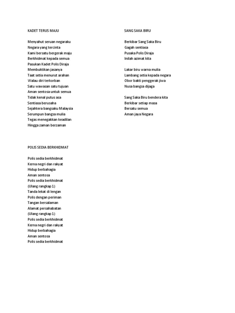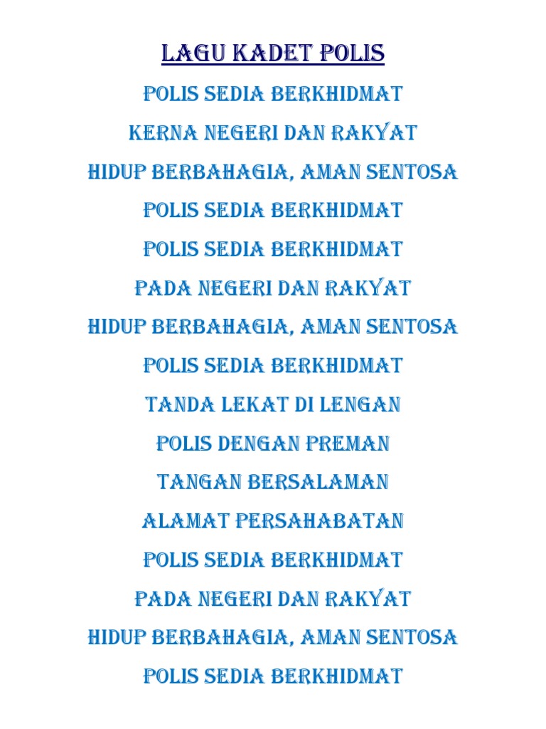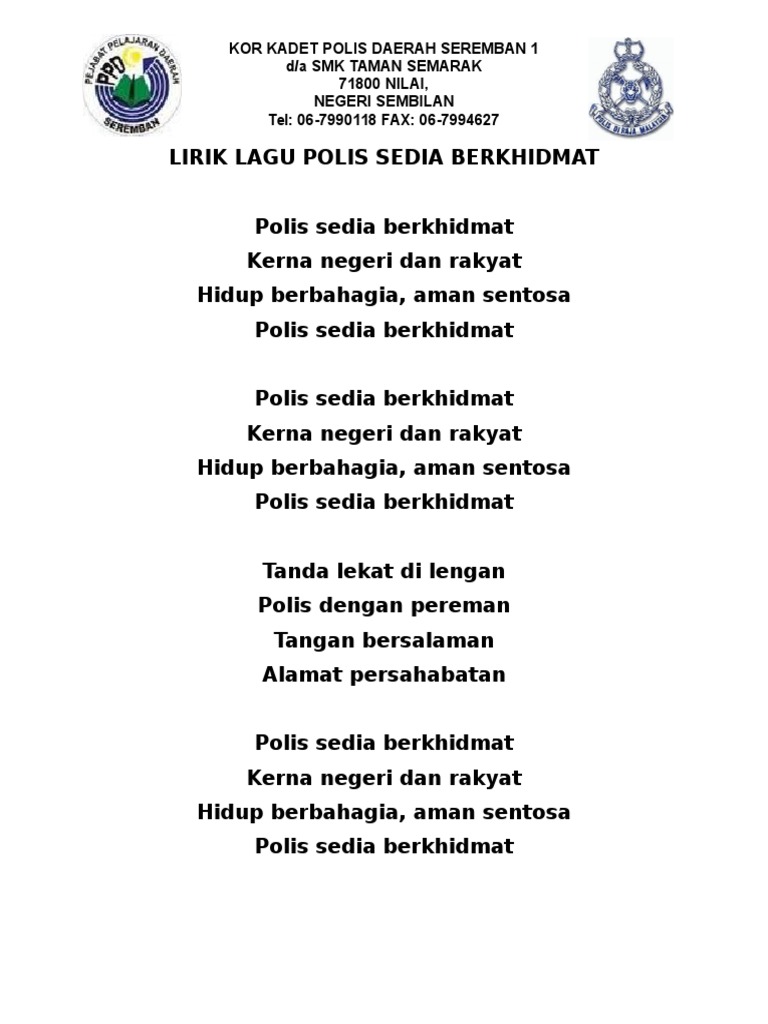 Polis sedia berkhidmat pada negeri dan rakyat hidup berbahagia, aman sentosa polis sedia berkhidmat. Müzik indir en kolay yolu. Lagu polis (sedia berkhidmat) original full lirik & video. Polis sedia berkhidmat lagu rasmi pdrm (karaoke tanpa vokal & lirik lagu). Polis sedia berkhidmat kerna negeri dan rakyat hidup berbahagia, aman sentosa polis sedia berkhidmat.