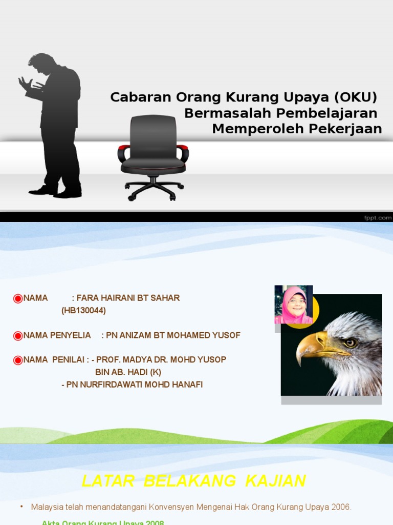 Daripada jumlah tersebut, 6% boleh menyesuaikan diri dengan kekurangan mereka, 4% memerlukan. Masalah yang dihadapi oleh orang kurang upaya. Cabaran oku ppt golongan orang kurang upaya oku masih terpinggir dalam kehidupan masyarakat dan status mereka agak menyedihkan terutama dalam bidang course hero Kelainan upaya adalah istilah yang meliputi gangguan, keterbatasan kegiatan, dan pembatasan penglibatan. Oleh itu, pengkaji ingin mengkaji :