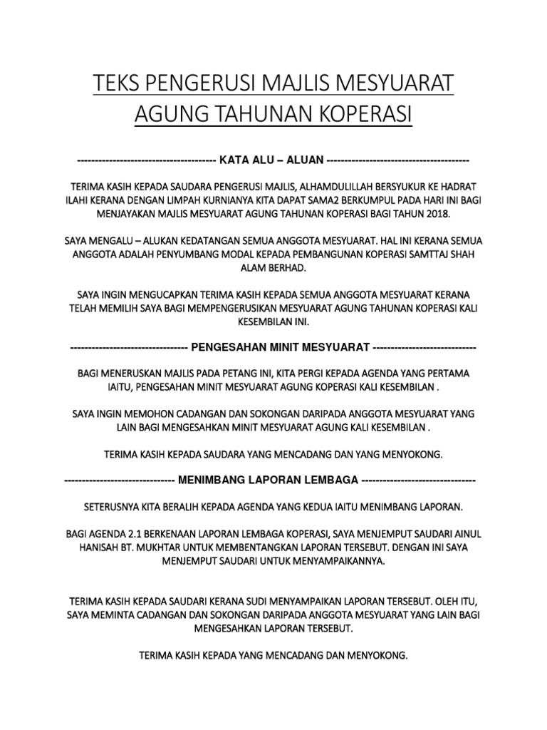 Yang mulia saudara pengerusi majlis. Dalam salah satu tulisan karya agung johann paul friedrich ritcher iaitu seorang penulis masyhur dari jerman ada menyatakan bahawa man feelings are always purest and most glowing in the hour of. Untuk memulakan mesyuarat kita memerlukan seorang pengerusi mesyuarat, jadi saya buka untuk cadangan. Masa cue ann 5 11.33 am orang asing dvd 1. Teks pengacara mesyuarat agung pibg by kementerian pelaj. To view this page ensure that adobe flash player version 10.0.0 or greater is installed. Guru boleh edit mengikut kesesuain majlis yang dibuat. •yang dihormati dan disanjung tinggi puan pengerusi/pengacara majlis: Yang berbahagia nama penyelia pejabat pelajaran daerah nama daerah. Sila download menggunakan link yang telah disediakan. Teks ucapan perasmian mesyuarat agung pibg. mohamad alif ketibaan tetamu perhatian kepada mahasiswa dan mahasiswi. Majlis teks ucapan sekolah ucapan akhir tahun kata kata persaraan ucapan penghargaan teks ucapan aluan ucapan rasmi contoh sijil anugerah teks pengacara hari sukan contoh ucapan pengucapan awam contoh teks ucapan pengerusi mesyuarat contoh ucapan hari raya contoh.
